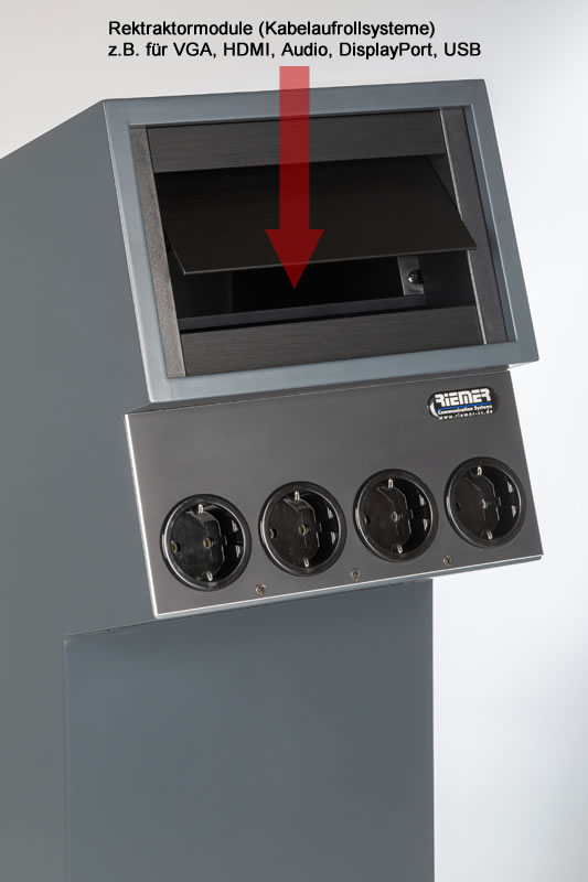 Im oberen mit einer Sichtblende verschließbaren Retraktor-Modulfach sind Anschlüsse für die individuelle Systemkonfiguration als Kabelaufrollsystem montiert, z.B. VGA, HDMI, DisplayPort, LAN, Audio, USB pp.