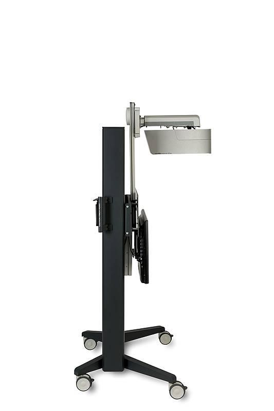 Das elektromotorisch höhenverstellbare Konsolensystem trägt die Visualizereinheit und sorgt für nötige Mobilität des Systems. Die Höhenverstellung erlaubt es, das Visualizersystem von ca. 2,00m auf die Transporthöhe von 1,10m zu senken.