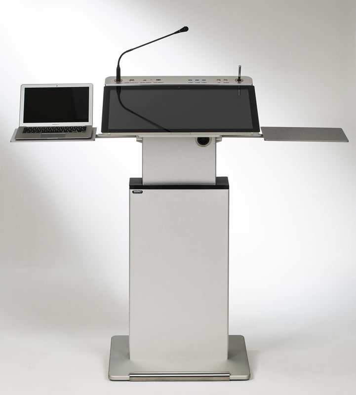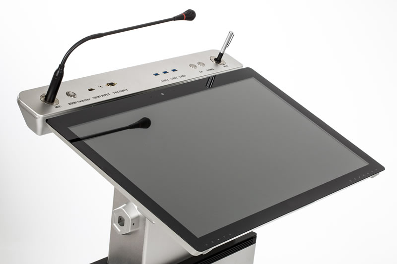 Pultmikrofon. Das HDMI-Anschlussfeld ist mit Digitalpriorität ausgestattet.