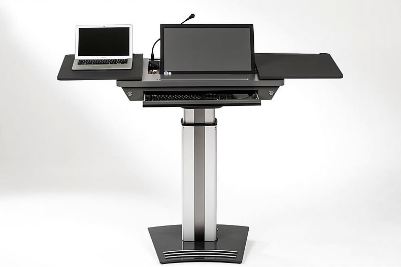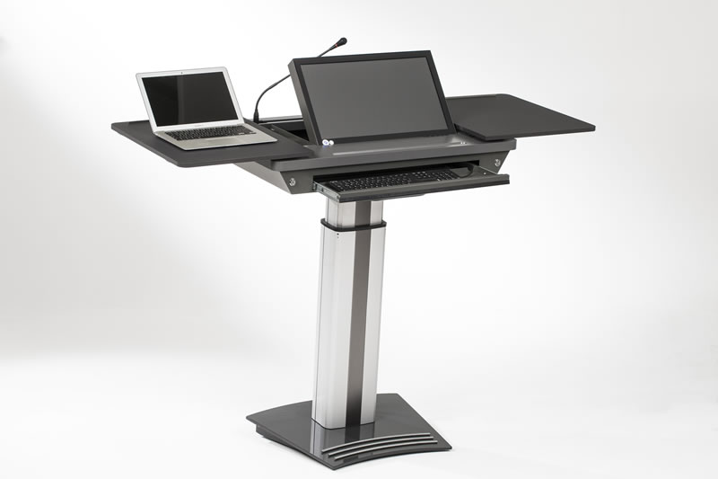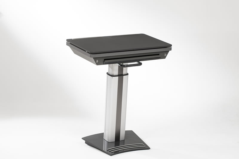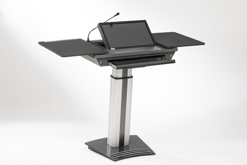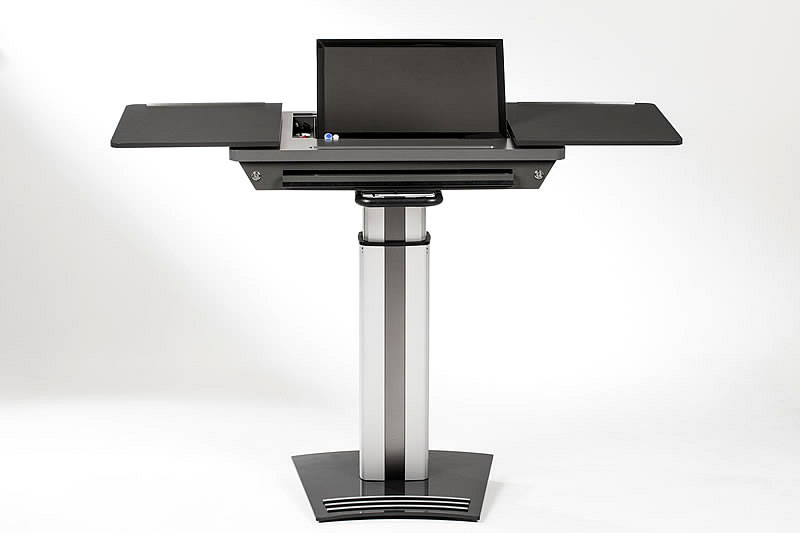In unserer Standardversion sind GeneralPower On/Off über einen Hauptschalter, die elektrische Höhenverstellung des Moderationspultes /-desks sowie das elektrische Schrägstellen des Displays im gewünschten Winkel integriert.